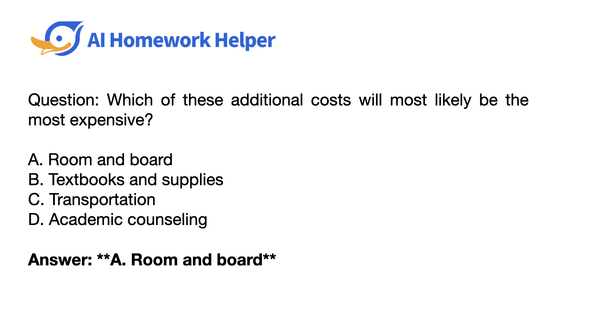 Answer: A. Room and board. Room and board typically represent the largest additional expense for students beyond tuition.