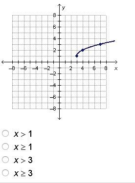 The graph starts at (x = 1) and extends to the right. This indicates that the function is defined for all (x) values greater than or equal to 1. Click for answers.