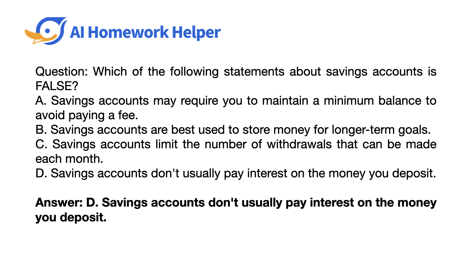 Answer: D. Savings accounts don't usually pay interest on the money you deposit.