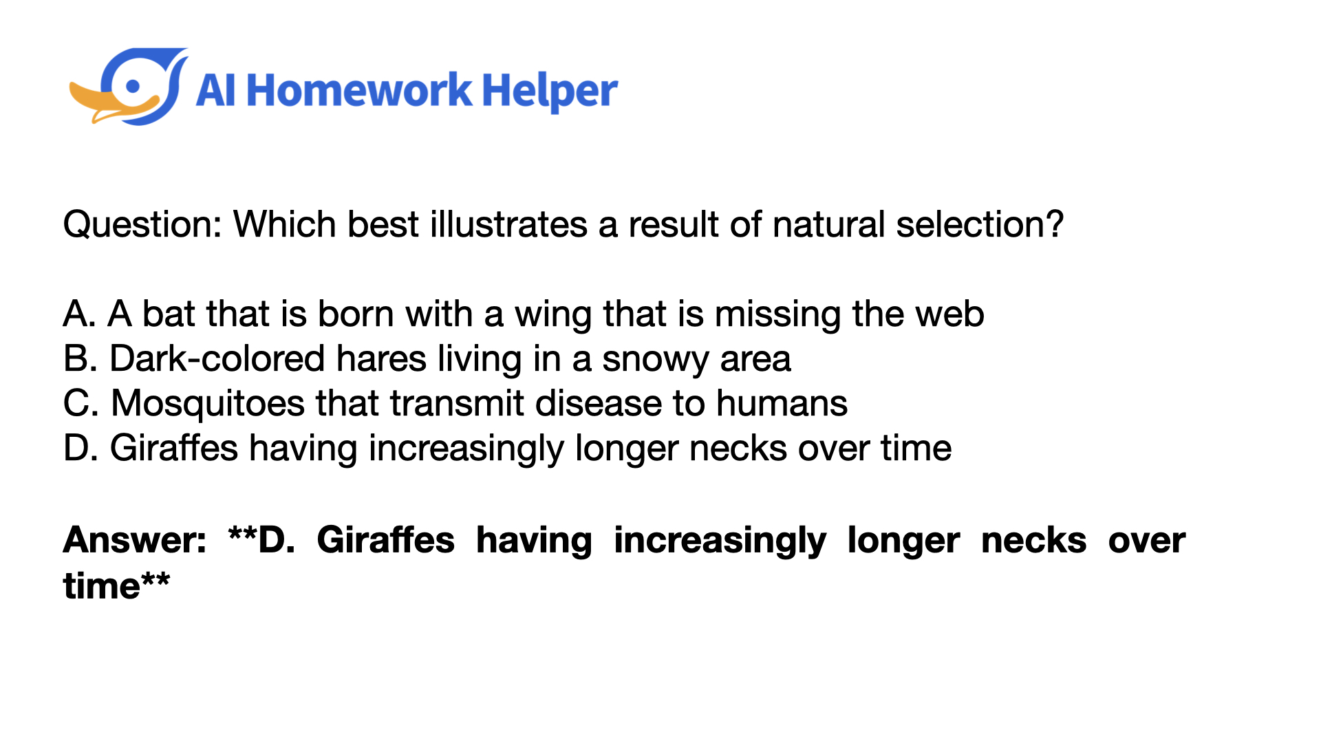 D. Giraffes having increasingly longer necks over time best illustrates a result of natural selection. This example clearly demonstrates how advantageous traits become more prevalent within a population, enhancing the organisms' ability to survive and reproduce in their specific environment.