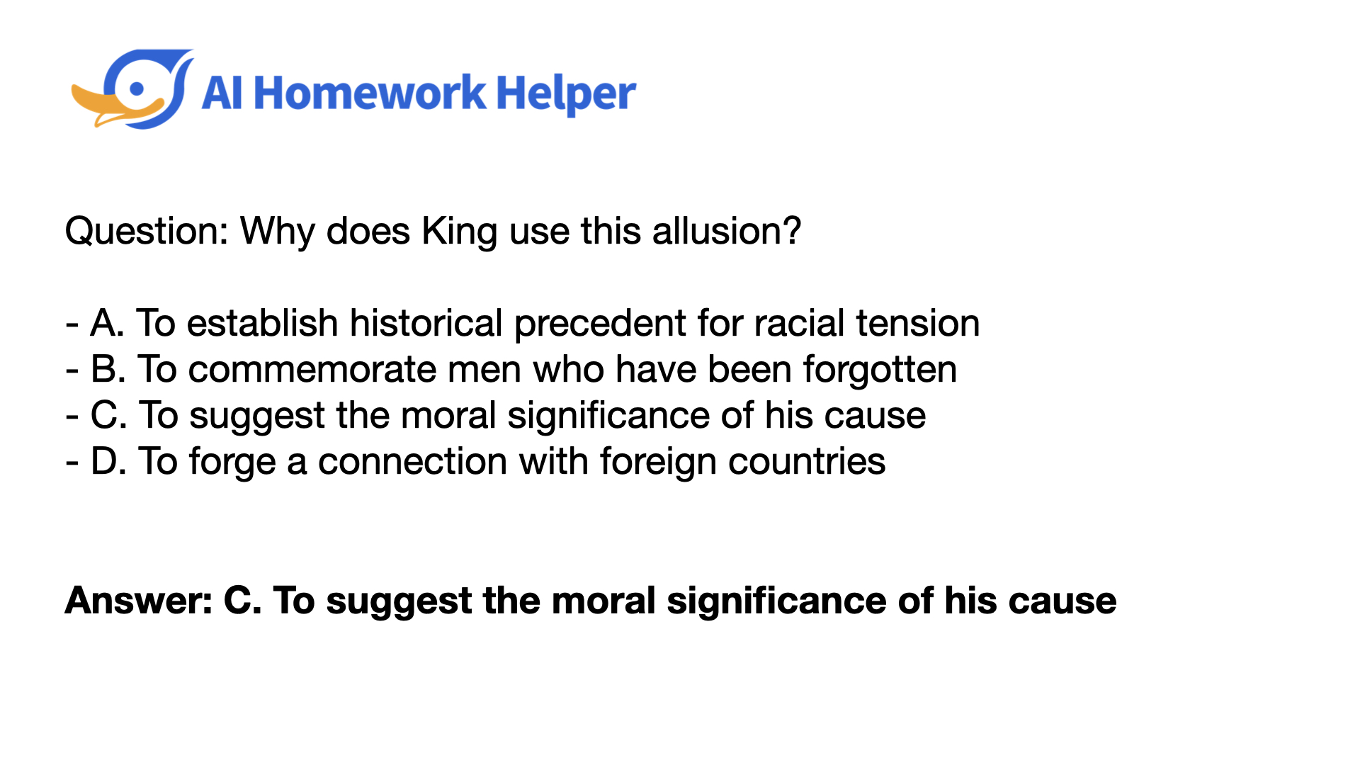 Option C: To suggest the moral significance of his cause is the correct answer. Martin Luther King Jr. frequently employed allusions in his speeches to highlight the ethical and moral foundations of the civil rights movement. By referencing historical events, revered figures, and foundational documents, King reinforced the righteousness and ethical imperative of striving for racial equality and justice.
